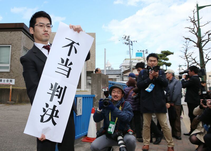 新潟水俣病第3次訴訟の一審判決を受け、「不当判決」の垂れ幕を掲げる原告側弁護士=2015年3月、新潟地裁