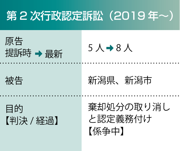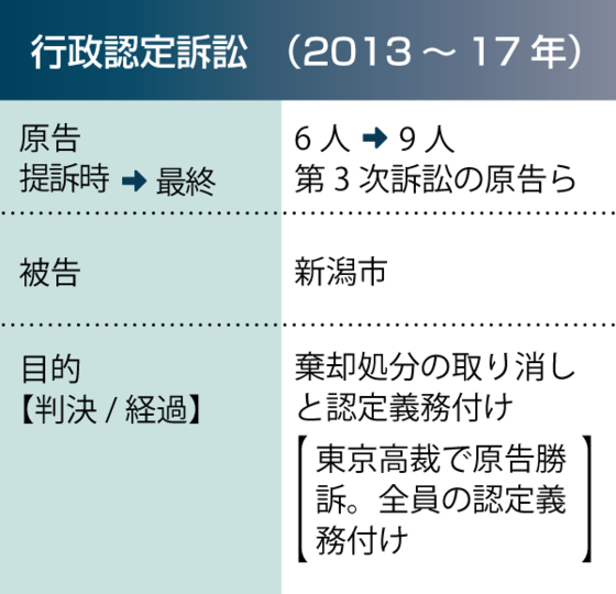 2013年の最高裁判決を受け、13年12月、新潟市に水俣病の認定申請を棄却された6人が市を相手取り、棄却処分の取り消しと認定の義務付けを求めて新潟地裁に提訴しました。新潟水俣病を巡る初めての行政訴訟となりました。