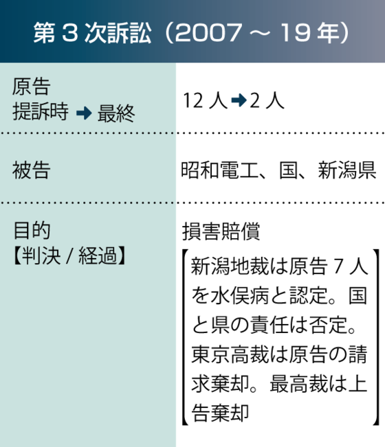 2007年4月、新潟市などの12人が国と新潟県、昭和電工に対して損害賠償を求めた新潟水俣病第3次訴訟が新潟地裁に提起されました。