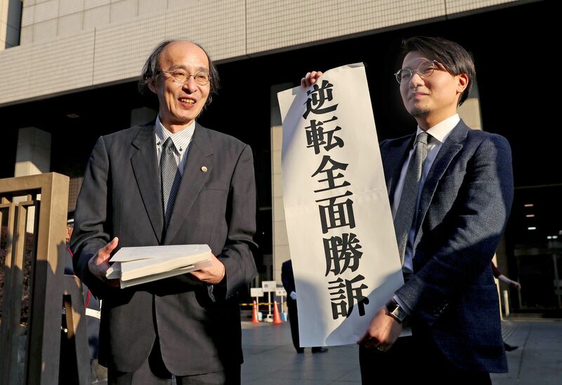 「逆転全面勝訴」と書かれた幕を掲げる原告側弁護士=2017年11月、東京高等裁判所前