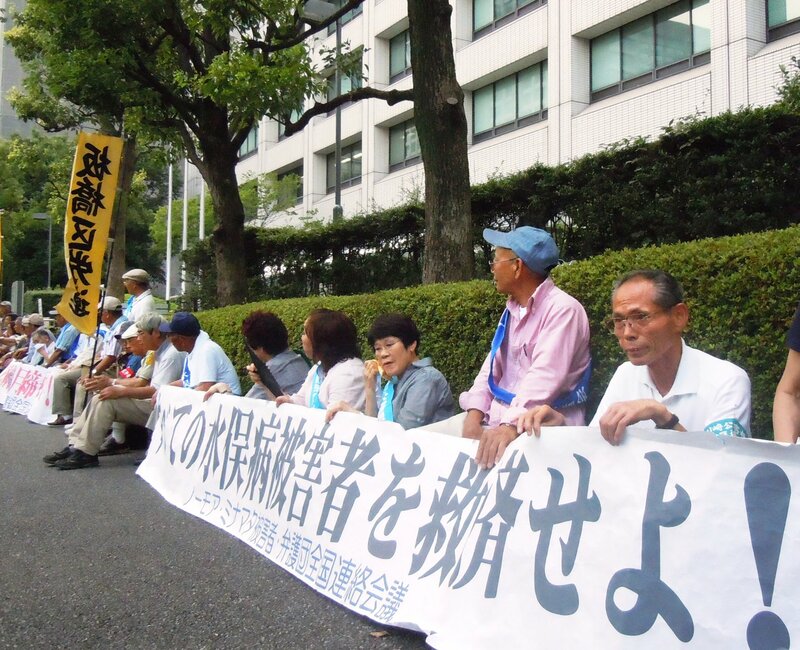 水俣病特措法の申請打ち切りなどに抗議し、環境省前で座り込む被害者団体のメンバーら=2012年7月、東京・霞が関