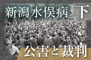 高度経済成長期1950年代半ばから、第1次オイルショックに見舞われた73年までの驚異的な経済成長。50年代は戦後の復興需要に支えられたが、60年代は製造業がめざましい発展を遂げ、輸出が拡大。池田内閣の「国民所得倍増計画」など経済最優先の政策により10年間の平均実質成長率が10%を超えた。前半は電気洗濯機、電気冷蔵庫、白黒テレビの「三種の神器」、後半は自動車、クーラー、カラーテレビの「3C」が急速に普及して、庶民の暮らしが大きく変わった。のひずみを象徴し、公害の原点といわれる水俣病熊本県水俣市のチッソ水俣工場から不知火海(八代海)に流された排水に、毒性の強いメチル水銀が含まれ、汚染された魚介類を食べた住民らに手足のしびれや感覚障害、視野狭窄(きょうさく)といった症状が相次いだ。1956年に公式に確認され、68年に国が公害と認定した。母親の胎内で影響を受けた胎児性患者もいる。根本的な治療法は見つかっていない。新潟水俣病、イタイイタイ病、四日市ぜんそくと並ぶ四大公害病の一つ。。国の被害者救済策が不十分だったために、多くの被害者が取り残され、全国で訴訟が繰り返されました。新潟水俣病1965年、阿賀野川流域で公式確認された。阿賀野川上流の鹿瀬町(現阿賀町)にあった昭和電工(現レゾナック・ホールディングス)の鹿瀬工場が、アセトアルデヒドの生産過程で生じたメチル水銀を含む排水を川に流し、汚染された川魚を食べた流域住民が、手足の感覚障害や運動失調などを発症する例が相次いだ。56年に熊本県で公式確認された水俣病に続く「第2の水俣病」と呼ばれる。が発生した新潟県でも争いが今も続き、新潟水俣病第5次訴訟水俣病被害を訴える新潟市などの男女が2013年12月、国と昭和電工(現レゾナック・ホールディングス)に損害賠償などを求め新潟地裁に提訴した訴訟。原告が水俣病かどうかや、九州に続き新潟県でも水俣病が発生したことに対する国の責任の有無が主な争点となっている。は提訴から10年余りを経て、2024年4月18日、新潟地裁で一部の原告に判決が言い渡されます。公式確認から60年近くたってもなお、終わらない新潟水俣病問題を振り返ります。(2回続きの2)=社会状況を伝えるため、写真や紙面は当時のものを掲載しています=