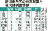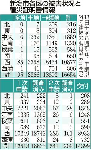 社会 能登半島地震 [能登半島地震]新潟県内の住宅被害は2万2368棟、新潟市は1万6654棟(4月18日時点) 2024/4/19 7:00 (最終更新: 2025/1/15 17:09) 能登半島地震による新潟県内の住宅被害は、4月18日時点で新潟県のまとめによると、2万2368棟に上った。県内全体で全壊104棟、半壊2966棟、一部破損1万9284棟となった。 新潟市では1万6654棟の被害が確認され、全壊95棟、半壊2866棟、一部破損1万3693棟。新潟市に寄せられた罹災(りさい)証明書の申請件数(重複など除く)は1万6513件で、このうち交付されたのは1万4399件。 外観に加えて家屋内部を調査する2次調査の申請件数は541件あり、調査を終えたのは209件となった。 トップページで最新情報を見る 関連ニュース [能登半島地震]政府が追加で1千億円支出へ インフラ再建や仮... 2024/4/17 [能登半島地震]新潟市西区で新たに全壊1棟を確認、新潟県内の... 2024/4/16 [能登半島地震]新潟県内の住宅被害は2万2069棟、新潟市は... 2024/4/12 能登半島地震の義援金受け付けを2027年3月31日まで延長 ... 12/13 [能登半島地震]被災住宅の公費解体、事業完了を新潟市長に報告... 12/9 「夕食難民」を救え! 地震で休業中、佐渡の老舗ホテルが和食居... 12/4 能登半島地震の被災者、避難の教訓語る 糸魚川市で防災講演会 12/3 [能登半島地震]新潟県内の住宅被害2万5415棟に・11月末時点 11/29 [能登半島地震の液状化対策事業]新潟市が地質の詳細調査へ、関... 11/26 [能登半島地震の液状化対策事業]新潟市が自治会別の説明会を開... 11/17 ビニールハウスや車…避難所以外で生活送る被災者への支援強化 ... 11/4 [能登半島地震]新潟県内の住宅被害2万5317棟に・10月末時点 11/1