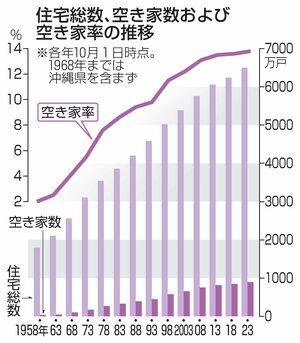 総務省が4月30日発表した住宅・土地統計調査国内の住宅事情を把握するため、1948年から5年ごとに実施されている調査。ページ下部に詳しい用語解説あり。(速報値)によると、全国の空き家数は2023年10月1日時点で900万戸だった。5年前の前回調査に比べ51万戸増え、過去最多を更新した。住宅総数に占める割合(空き家率)は 0・2ポイント上昇し、...
