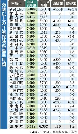 65歳以上の高齢者が支払う介護保険料について、新潟県は4月30日、2024〜2026年度の県内30市町村の保険料基準額を発表した。県平均は月額6412円で、前の期間の21〜23年度よりも110円増えて過去最高となった。伸び率は1・7%で、前回改定時の2・0%より縮小した。制度が始まった00年度の県平均は2774円だったが、高齢化を背景に当初の約2・3倍に膨らんだ。