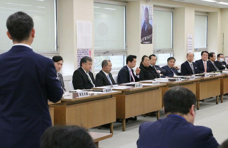 内閣府の幹部から原発事故時の避難計画などについて説明を受ける自民党の県議ら=3月、県議会