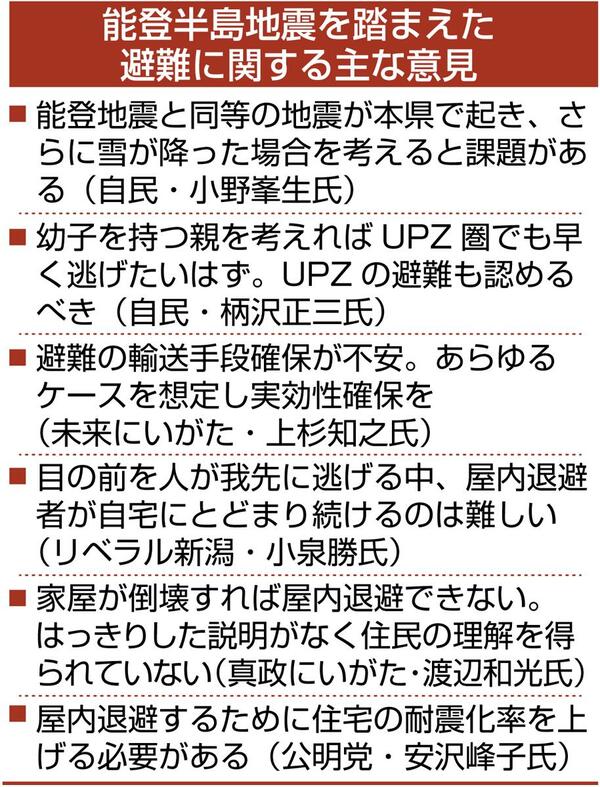 公明県本部代表の市村浩二氏(新潟市中央区)は避難道路の整備計画が出ていないことなどを理由に「判断材料がそろっていない」と述べるにとどめた。