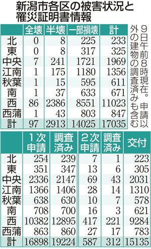 社会 能登半島地震 [能登半島地震]新潟県内の住宅被害は2万2947棟、新潟市は1万7035棟(5月9日時点) 2024/5/10 8:30 (最終更新: 2025/1/15 16:55) 能登半島地震による新潟県内の住宅被害は、県のまとめによると、5月9日時点で2万2947棟となった。県内全体で全壊は106棟、半壊3021棟、一部破損1万9806棟。 新潟市では1万7035棟の被害が確認され、全壊97棟、半壊2913棟、一部破損1万4025棟となった。市に寄せられた罹災(りさい)証明書の申請件数は1万6898件で、このうち交付したのは1万5135件。外観に加えて家屋内部を調査する2次調査の申請件数は587件で調査を終えたのは312件となった。 トップページで最新情報を見る 関連ニュース 能登半島地震の義援金受け付けを2027年3月31日まで延長 ... 12/13 [能登半島地震]被災住宅の公費解体、事業完了を新潟市長に報告... 12/9 「夕食難民」を救え! 地震で休業中、佐渡の老舗ホテルが和食居... 12/4 能登半島地震の被災者、避難の教訓語る 糸魚川市で防災講演会 12/3 [能登半島地震]新潟県内の住宅被害2万5415棟に・11月末時点 11/29 [能登半島地震の液状化対策事業]新潟市が地質の詳細調査へ、関... 11/26 [能登半島地震の液状化対策事業]新潟市が自治会別の説明会を開... 11/17 ビニールハウスや車…避難所以外で生活送る被災者への支援強化 ... 11/4 [能登半島地震]新潟県内の住宅被害2万5317棟に・10月末時点 11/1 [能登半島地震の液状化対策事業]自治体単位の説明会、新潟市が... 10/31 [能登半島地震の液状化対策事業]住民負担金巡り相次ぐ異論…全... 10/28 [能登半島地震の液状化対策事業]新潟市西区で全体説明会、住民... 10/11
