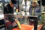 ふたが盗まれた給水栓の上に、合板で手作りした板をかぶせる髙野幸夫さん=上越市吉川区