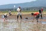北村さんが田にお神酒を注ぎ入れた後、3人の早乙女が水田の中央を中心に後ずさりしながら苗を植えていった。あぜでは田植え唄を歌うのが習わしで、内海府小中学校の児童生徒6人が「ダンエーカカエ」などと元気な歌声を響かせた。