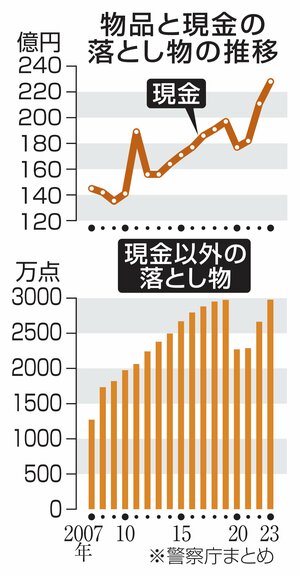 社会 全国の「落とし物」2023年は過去最多3000万点!!感染対策の緩和による人出の増加、電化製品の小型化が影響か 2024/5/28 9:00 2023年に全国の警察に拾得物として届けられた現金以外の「落とし物」は、前年から約315万点増の2978万7068点で、統計のある1971年以降で過去最多だったことが5月27日、警察庁への取材で分かった。... 残り824文字(全文:927文字) ここから先を読むには 続きを読む(会員登録する) 続きを読む(ログイン) 新潟日報朝刊を購読していますか? はい いいえ トップページで最新情報を見る 関連ニュース 「落とし物」の現金、なんと計2億7900万円!2023年新潟... 2024/3/24 特殊詐欺事件で使用された口座、譲り渡した疑いで村上市の男逮捕 11/12 年金の還付金名目で現金だまし取った疑い、兵庫県の男を逮捕「出... 11/12 [新潟市中学校いす引き問題]第三者委が調査開始 母親「校長、... 11/12 新潟県内でオーロラ観測!北の夜空、赤く染める 村上市で新潟日... 11/12 [新発田市女性殺害事件]被告が異議申し立て…最高裁の上告棄却に 11/12 重川県議の記者暴行「極めて卑劣」新聞労連が抗議声明 11/12 息子など名乗り2300万円だまし取った疑い、東京の男を逮捕 ... 11/12 「油断避けるため」新発田市、11日の緊急銃猟を報道発表せず ... 11/12 小千谷の養鯉池、鯉食べるクマを目撃 11/12