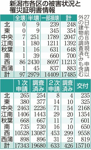 社会 地震・災害 能登半島地震 [能登半島地震]新潟県内の住宅被害2万3481棟、新潟市は1万7485棟(5月27日時点) 2024/5/28 7:00 (最終更新: 2025/1/15 15:43) 能登半島地震による新潟県内の住宅被害は、県のまとめによると、5月27日時点で2万3481棟に上った。全壊106棟、半壊3089棟、一部破損2万272棟となった。 新潟市では1万7485棟の被害が確認され、全壊97棟、半壊2979棟、一部破損1万4409棟。市に寄せられた罹災(りさい)証明書の申請件数は1万7343件で、このうち1万5710件を交付した。外観に加えて家屋内部を調査する2次調査の申請件数は633件で、調査を終えたのは426件。 トップページで最新情報を見る 関連ニュース 新潟上越地域の景況感2期連続で悪化 2024年1~3月期・上... 2024/5/26 梅雨迎える液状化被災地…新潟市は浸水、冠水に土のう配布やポン... 2024/5/25 [能登半島地震]新潟県内の住宅被害2万3356棟、新潟市は1... 2024/5/24 ビニールハウスや車…避難所以外で生活送る被災者への支援強化 ... 11/4 [能登半島地震]新潟県内の住宅被害2万5317棟に・10月末時点 11/1 [能登半島地震の液状化対策事業]自治体単位の説明会、新潟市が... 10/31 [能登半島地震の液状化対策事業]住民負担金巡り相次ぐ異論…全... 10/28 [能登半島地震の液状化対策事業]新潟市西区で全体説明会、住民... 10/11 [能登半島地震の液状化対策事業]生活保護世帯など負担金免除の... 10/8 [能登半島地震の液状化対策事業]費用の住民負担、全地権者への... 10/8 能登の巨大灯籠「キリコ」石川県輪島市井面集落から小千谷市に…... 10/7 [能登半島地震の液状化対策事業]「住民負担の軽減を」新潟市議... 10/7