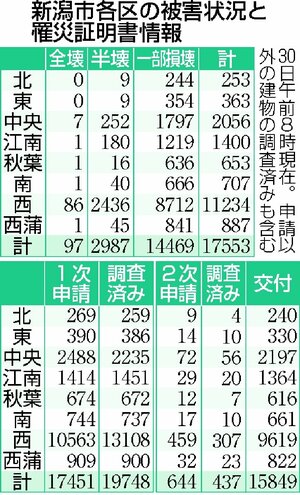 新潟市に寄せられた罹災(りさい)証明書の申請件数は1万7451件で、このうち1万5849件を交付した。外観に加えて家屋内部を調査する2次調査の申請件数は644件で、調査を終えたのは437件。