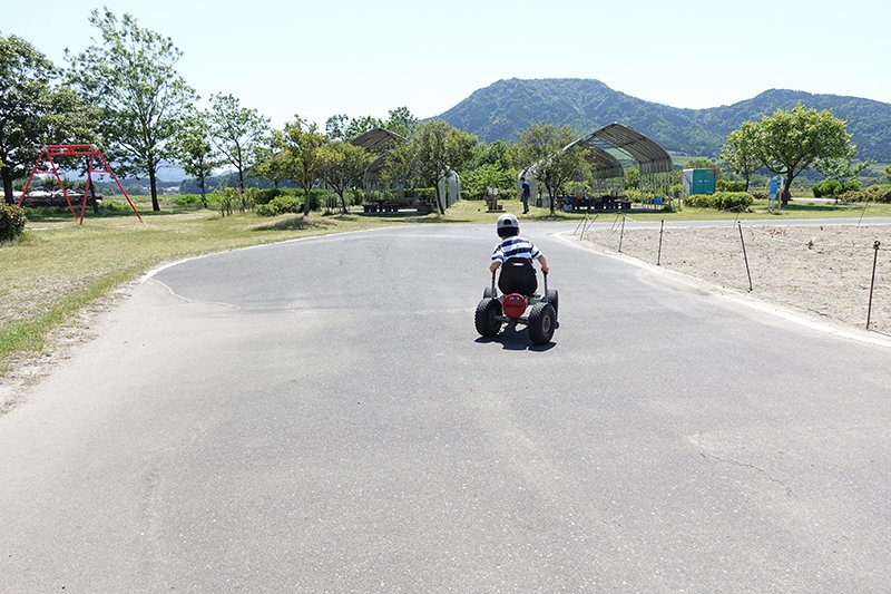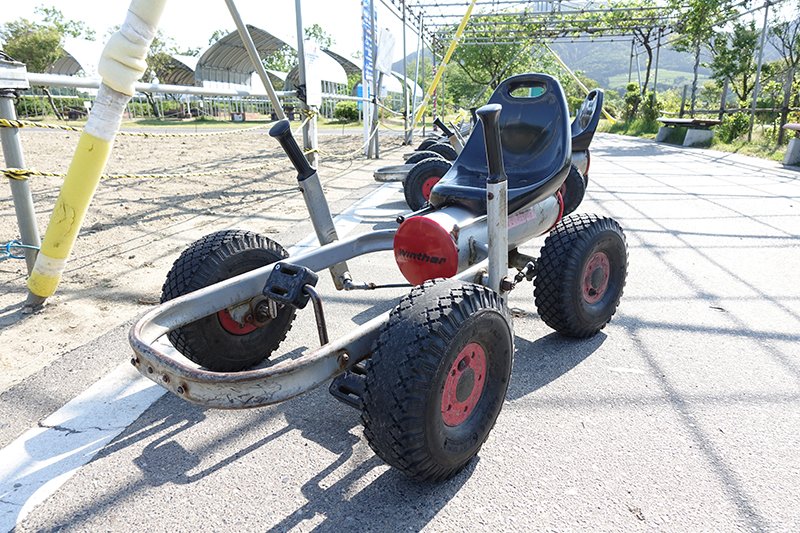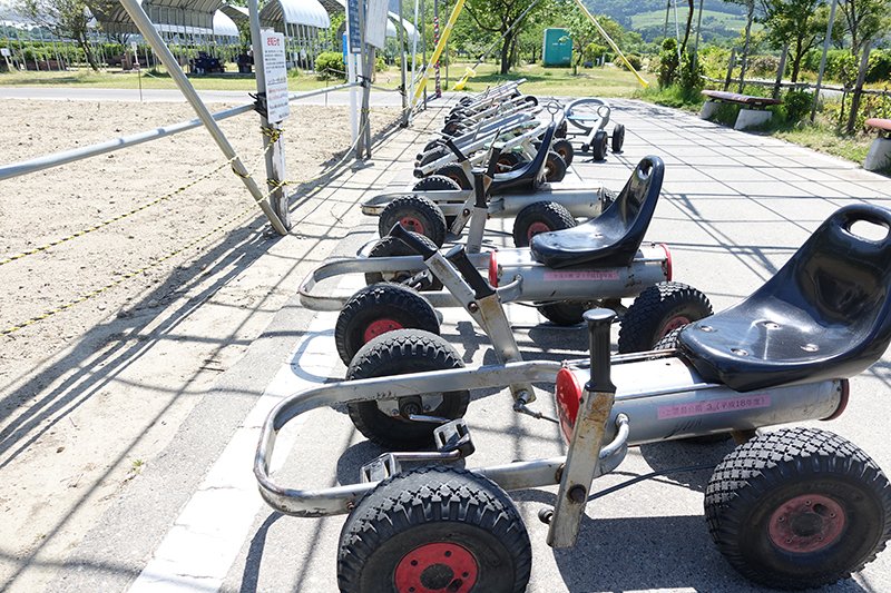 出たー!ペダルカートだー!言わずと知れた公園遊具のスーパースター。一度乗ったらひたすら走り続けたくなる魔性の乗り物。太めのタイヤがワイルドです。探検隊を率いる隊長と言えども、その魅力にあらがうことはできません。