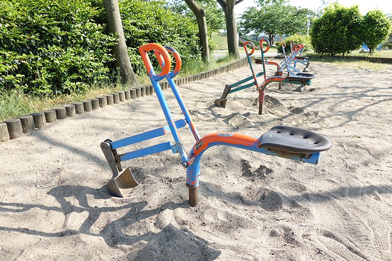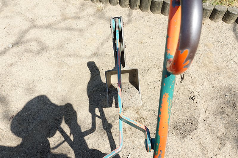 手当たり次第に楽しんだ後、ちょっと変わった遊具を見つけました。ショベルカーをミニサイズにしたような形で、左右のレバーを操って砂を掘り起こす仕組みです。結構奥が深く、黙々と土木作業に精を出す隊長と助手。気づけばかなりの時間を費やしていました。まさか、何者かによる足止めの罠なのか!?