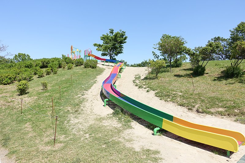 続いては、虹を思わせるポップなカラーリングとは裏腹に、おしりが燃え上がりそうなほど急滑走のローラー滑り台。