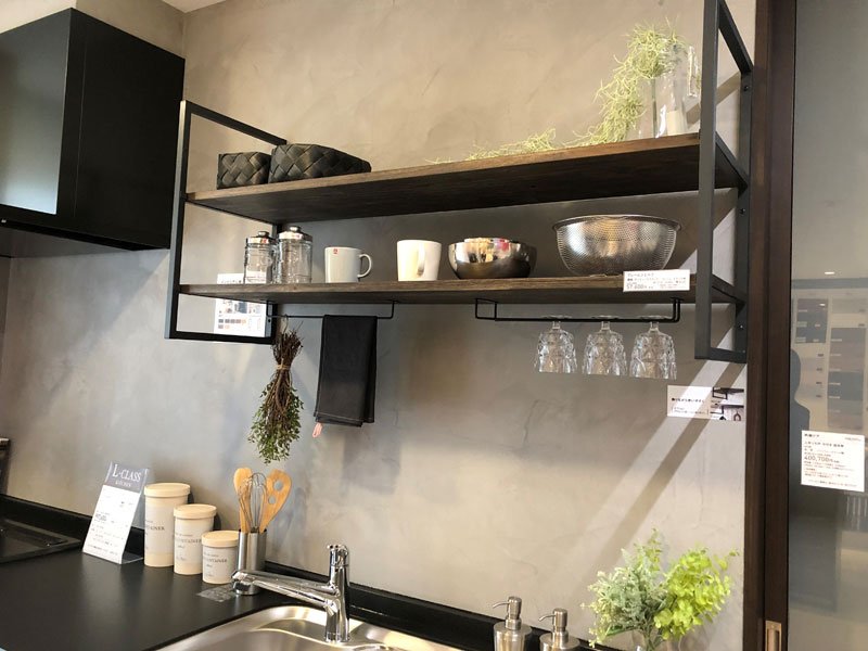また、隣にあるもう一つのシステムキッチンは、まるでトレンディドラマ(古くて申し訳ないです)に出てくるかのようなすてきなインテリアで魅せるキッチンを演出!こちらは私もよくウインドウショッピングにお邪魔する新潟市鳥屋野のインテリアショップS H Sさんとのコラボレーションだとか。どうしても生活感がダダ漏れするキッチンが、こんなにすてきな空間に変わるなんて、プロの技をここから学んで生かせれば我が家もワンランク上のキッチン空間に変身するかも。