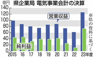 新潟県営の水力と太陽光発電所を運営する県企業局は5月31日までに、2023年度の電気事業会計決算を発表した。23、24年度の水力発電の売電単価が大幅に上振れたことで、水力と太陽光による売電収入などを合計した営業収益は、22年度の倍となる125億9674万円で過去最高となった。営業収益から発電や災害復旧にかかる経費などを差し引いた純利益も、前年度の約6・5倍となる73億1787万円で過去最高だった。