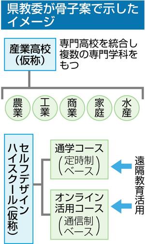 産業高校は、生徒が自分の専門科目に加え他の専門科目も学ぶことを想定。専門的な学習設備が必要な場合は、統合前の施設を活用する「キャンパス制」導入も検討する。現在の総合高校とのすみ分けについては今後議論するという。