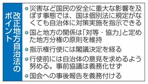 政治・行政 国政 改正地方自治法が成立、非常時に自治体への国の指示権拡大 曖昧な行使要件、地方自治への不当介入の懸念残る・9月下旬にも施行へ 2024/6/20 8:15 大規模な災害などの非常時に自治体に対する国の指示権を拡大する改正地方自治法が6月19日、参院本会議で自民、公明、日本維新の会、国民民主各党などの賛成多数により可決、成立した。9月下旬にも施行される。... 残り717文字(全文:817文字) ここから先を読むには 続きを読む(会員登録する) 続きを読む(ログイン) 新潟日報朝刊を購読していますか? はい いいえ トップページで最新情報を見る 関連ニュース 日本維新の会、新潟1区に伊藤和成氏擁立へ 県組織「新潟維新の... 1/19 共産党県委員会、新潟1区に中村岳夫氏擁立で最終調整 19日に... 1/18 新党結成による試算、自民勝利の44選挙区で逆転する結果に 前... 1/17 立憲民主新潟県連が緊急幹事会、現職2人は新党参加の方向か 2... 1/17 【新党合意】「政権への大きな対抗軸」県選出の立憲民主国会議員... 1/15 高市首相・通常国会冒頭での衆院解散検討を伝達、自民関係者に ... 1/11 [コラム・キャスターEYE]<今年の漢字を考えた>首相が連発... 2025/12/23 官邸筋「核持つべきだと思っている」 安全保障担当、非公式取材... 2025/12/18 衆院議員定数削減法案の結論は持ち越し…県関係国会議員の受け止... 2025/12/17 大阪・関西万博の建設工事費未払い、米山隆一氏ら業者救済へ法案... 2025/12/15 衆院議員定数減法案の撤回求め、中山均・新潟市議らが会見 無所... 2025/12/11 高市早苗首相「押しかけるわけにはいかない」柏崎刈羽原発訪問に... 2025/12/10