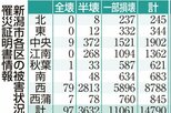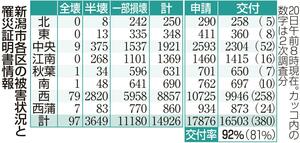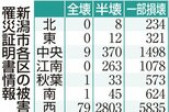 社会 地震・災害 能登半島地震 [能登半島地震]新潟県内の住宅被害2万1055棟に 新潟市は1万4926棟(6月20日時点) 2024/6/21 7:00 能登半島地震による新潟県内の住宅被害は、県のまとめによると、6月20日時点で2万1055棟に上った。県内全体で全壊106棟、半壊3759棟、一部破損1万7176棟などとなっている。 新潟市では1万4926棟の被害が確認され、全壊97棟、半壊3649棟、一部破損1万1180棟。市に寄せられた罹災(りさい)証明書の申請件数は1万7876件で、このうち1万6503件を交付した。 トップページで最新情報を見る 関連ニュース [能登半島地震]新潟県内の住宅被害2万902棟に 新潟市は1... 2024/6/17 [能登半島地震]新潟県内の住宅被害2万846棟に 新潟市は1... 2024/6/14 [能登半島地震]新潟県内の住宅被害、2万679棟に 新潟市は... 2024/6/11 [能登半島地震]新潟市で新たに1人の重傷者確認、新潟県内で計... 2024/6/7 [能登半島地震]新潟県内の住宅被害2万3645棟、新潟市は1... 2024/6/3 能登半島地震の義援金受け付けを2027年3月31日まで延長 ... 12/13 [能登半島地震]被災住宅の公費解体、事業完了を新潟市長に報告... 12/9 「夕食難民」を救え! 地震で休業中、佐渡の老舗ホテルが和食居... 12/4 能登半島地震の被災者、避難の教訓語る 糸魚川市で防災講演会 12/3 [能登半島地震]新潟県内の住宅被害2万5415棟に・11月末時点 11/29 [能登半島地震の液状化対策事業]新潟市が地質の詳細調査へ、関... 11/26 [能登半島地震の液状化対策事業]新潟市が自治会別の説明会を開... 11/17