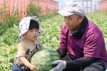 ハウス団地でスイカを収穫する男性(左)=新潟市西区