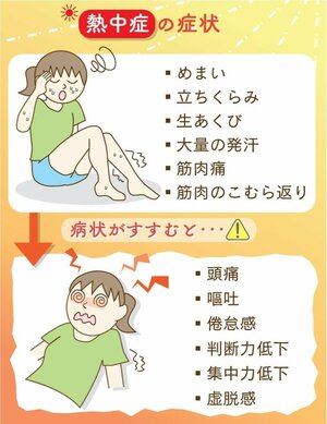 熱中症には、炎天下の屋外で数時間の運動や労働で発症する「労作性熱中症」と、高齢者が屋内で数日かけて悪化する「非労作性熱中症」があります。