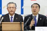 記者会見するラグビー日本代表のジョーンズHC(右)ら=27日、福岡市((c)JRFU)