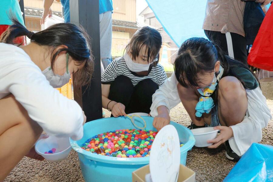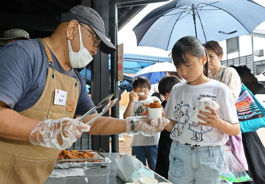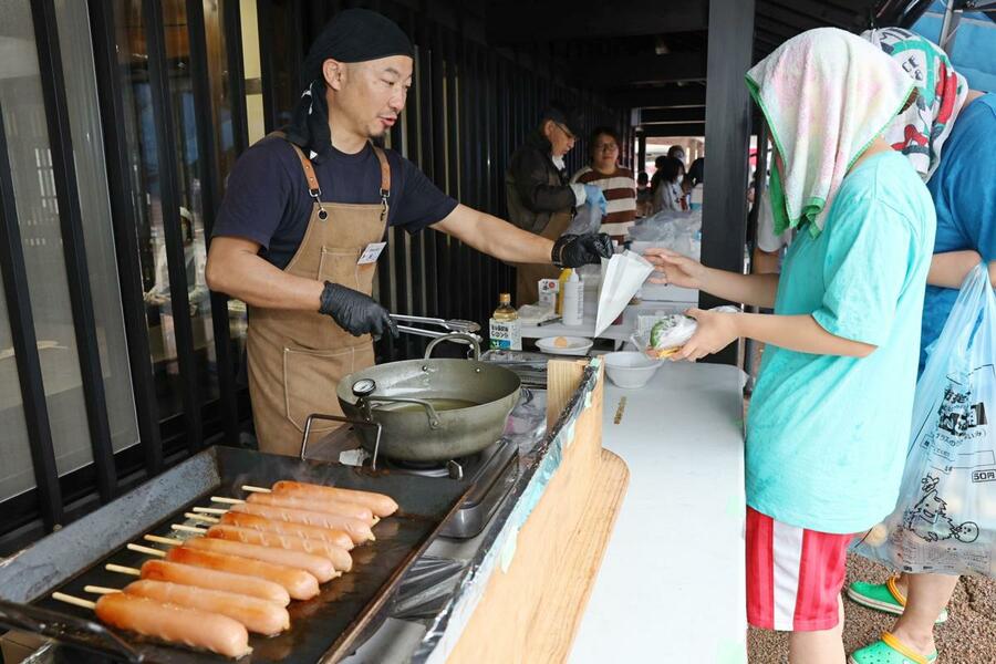 輪島塗の体験や見学ができる施設「輪島工房長屋」の軒先が“縁日”の場になった。子どもたちはから揚げやフィリピン風かき氷をほおばり、綿あめ作りに挑戦。小学3年の女子(8)は「おいしくて、楽しくて、うれしかった」と笑顔を見せた。