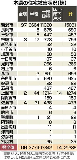 新潟市では1万5081棟の被害が確認され、県内全体の約7割を占める。内訳は全壊97棟、半壊3664棟、一部破損1万1320棟。6月27日現在で、市に寄せられた罹災(りさい)証明書の申請件数は1万8091件に上り、このうち92%に当たる1万6690件を交付した。
