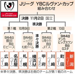 スポーツ Jアルビ [サッカールヴァンカップ・J1アルビレックス新潟]準々決勝の対戦相手はJ1首位の町田に決定! 9月4、8日にホームアンドアウェーの2戦で勝負 2024/7/2 19:35 Jリーグ・YBCルヴァン・カップの組み合わせ抽選が7月2日に行われ、アルビレックス新潟はJ1で首位を走る町田との対戦が決定した。ホームアンドアウェー方式で行う準々決勝は、9月4日の第1戦がデンカビッグスワン... 残り319文字(全文:423文字) ここから先を読むには 続きを読む(会員登録する) 続きを読む(ログイン) 新潟日報朝刊を購読していますか? はい いいえ トップページで最新情報を見る 関連ニュース [サッカールヴァンカップ・J1アルビレックス新潟]土砂降りの... 2024/6/10 [サッカールヴァンカップ・J1アルビレックス新潟]長崎の猛攻... 2024/6/9 平均失点リーグワースト、2桁得点達成者なし…苦戦の様子データ... 12/8 【寺川強化本部長総括】いま明かす苦悩の裏側「全くかみ合わず」... 12/8 [サッカー・オランダ1部]三戸舜介(スパルタ)が今季初ゴール... 12/8 [アルビレックス新潟]樹森大介元監督、来季J1の水戸監督に 12/8 [アルビレックス新潟]J2降格「草刈り場」に?船越新監督はチ... 12/7 [アルビレックス新潟]船越優蔵氏の監督就任を発表「チームを必... 12/7 [アルビ試合後リポート]チームを去るキャプテン堀米悠斗、千葉... 12/6 来季J2のアルビレックス新潟、新監督にOB船越優蔵氏が就任へ 12/6 [アルビレックス新潟]19戦連続未勝利でシーズン終了…FC東... 12/6 [アルビレックス新潟]連続未勝利ストップするか…今季最終戦で... 12/5