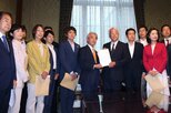 水の汚れを調べる五泉南小の児童ら=五泉市駅前2