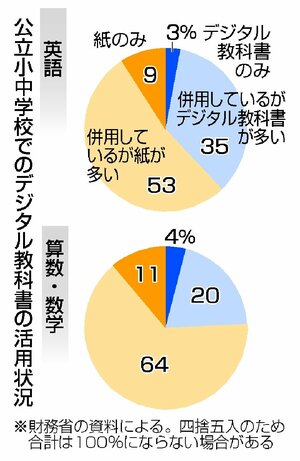 財務省が全国の公立小中学校の教員を対象に実施した調査で、英語の授業でデジタル教科書タブレット端末やパソコンに表示して使う教科書。学校教育法改正により、2019年度から小中高校の授業で正式な教科書として使えるようになった。詳細はページ下部に記載。のみを使っているとの回答が3%にとどまったことが分かった。算数・数学は4%だった。政府は小中学生に1人1台のタブレット端末や...