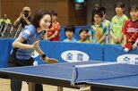 教室は、NTT東日本が地域のスポーツ振興への貢献などを目的に開催している。この日は、市内の中学2、3年生約60人が参加。2023年の全日本総合選手権・混合ダブルスでベスト4入りを果たした日本A代表の緑川大輝(ひろき)選手ら16人が指導した。
