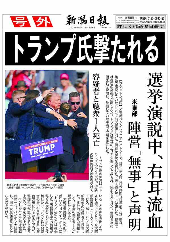 【号外】トランプ氏撃たれる、右耳流血 選挙演説中 2024/7/14 11:00 (最終更新: 2024/7/14 11:23) PDFで号外を見る トップページで最新情報を見る 関連ニュース 【号外】米、イスラエル両軍がイラン攻撃 2/28 【号外】フィギュア女子で中井亜美(新潟市出身)が「銅」! 2/20 【号外】フィギュアペア・りくりゅう金メダル!日本勢初 2/17 【号外】スノボ男子HPで戸塚が金、山田が銅、平野(歩)は7位 2/14 【号外】スノーボード女子ビッグエアで村瀬心椛が「金」 2/10 【号外】スノーボード男子ビッグエアで木村葵来が金、木俣は銀 2/8 【号外】センバツ高校野球、帝京長岡と日本文理が出場決定! 1/30 【号外】衆院選、2月8日投開票 高市早苗首相が23日解散を表明 1/19 【号外】首相、衆院冒頭解散へ 1/13 【号外】柏崎刈羽原発再稼働「同意」、花角知事が赤沢経産相に伝達 2025/12/23 【号外】柏崎刈羽原発再稼働「容認」 新潟県議会、花角英世知事を信任 2025/12/22 【号外】新潟県知事が柏崎刈羽原発再稼働を容認 2025/11/21