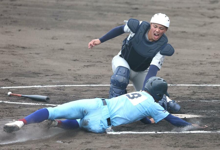 中越-加茂暁星 1回裏加茂暁星2死二塁で本塁に向かう石﨑魁皇をタッチアウトにする中越の捕手樋口優志=柏崎市佐藤池野球場