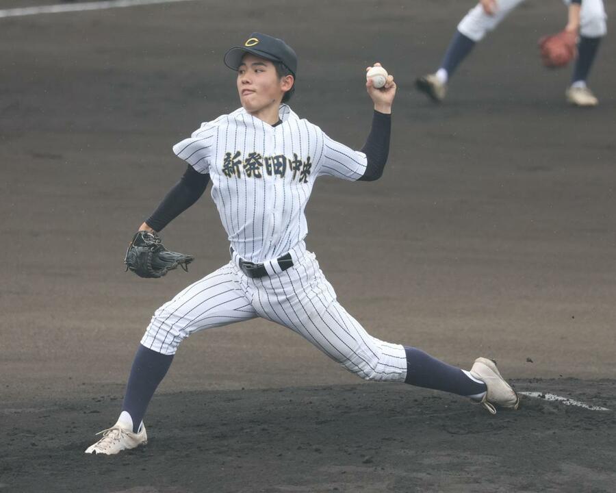 糸魚川-新発田中央 新発田中央先発の大矢隼輝=柏崎市佐藤池野球場