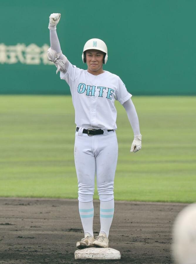 長岡大手-東京学館 4回表、長岡大手2死二塁、左中間に適時二塁打を放ち塁上でガッツポーズをとる井上凌佑=長岡市悠久山球場