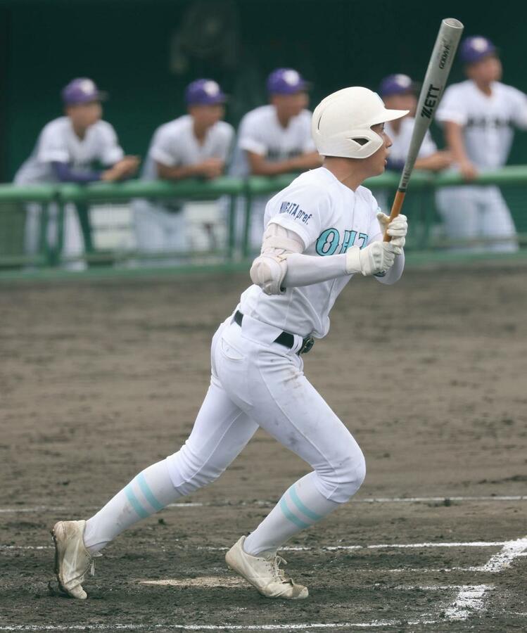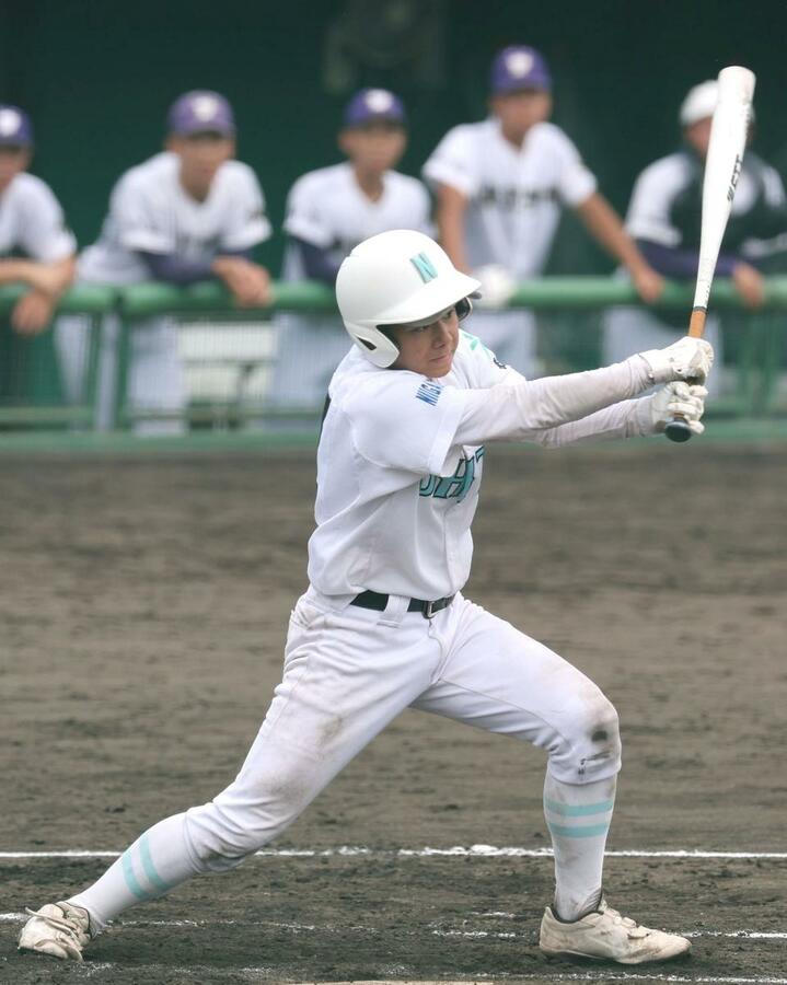 長岡大手-東京学館 8回表、長岡大手1死二塁、佐藤逸生が右前に勝ち越しの適時打を放ち2-1=長岡市悠久山球場