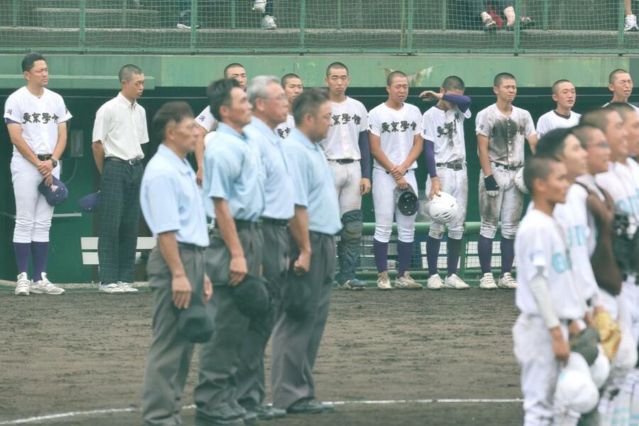 長岡大手-東京学館 長岡大手に敗れ悔し涙を流す東京学館の選手ら=長岡市悠久山球場