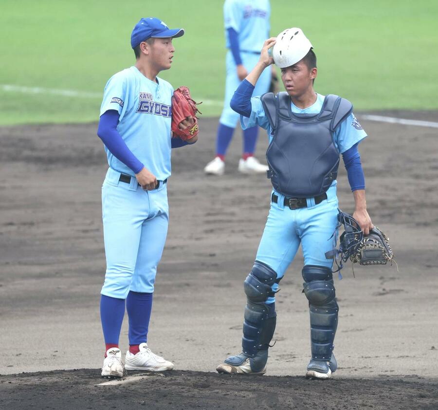 中越-加茂暁星 3回表2死三塁のピンチで加茂暁星のエース真保龍聖(左)に駆け寄る捕手加藤力=柏崎市佐藤池野球場