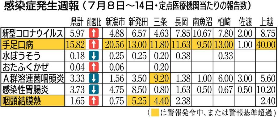 新潟県は7月18日、全県に警報を発令している手足口病について、7月8〜14日の1週間の報告数が1医療機関当たり15・82人となったと発表した。前週(1〜7日)の10・67人から約1・5倍に増加。全国的には過去10年で最多のペースで増加しており、県も注意を呼びかけている。
