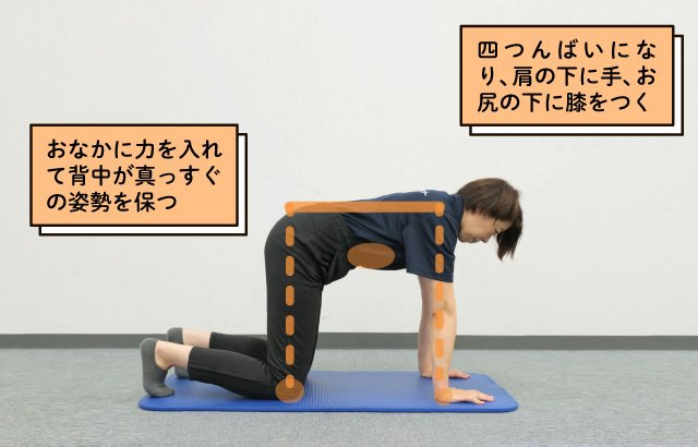 (1)四つんばいになり、肩の下に手、お尻の下に膝をつく。