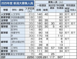 25年度入試は、新学習指導要領に対応した初の大学入学共通テストが実施され、教科・科目が再編される。これに伴い、新潟大は全学部の一般選抜の受験生に対し、共通テストで「情報Ⅰ」を必須科目とした。