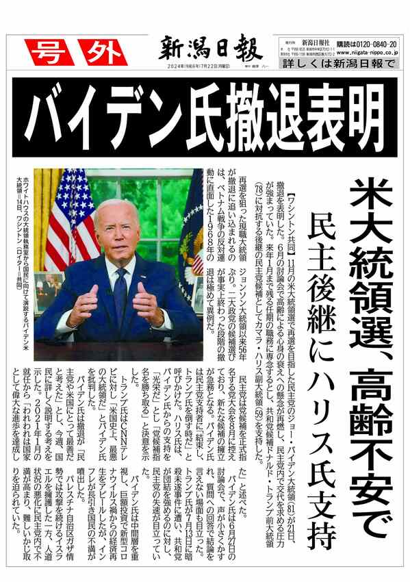 【号外】バイデン氏撤退表明 2024/7/22 7:20 (最終更新: 2024/7/22 7:22) PDFで号外を見る トップページで最新情報を見る 関連ニュース 【号外】米、イスラエル両軍がイラン攻撃 2/28 【号外】フィギュア女子で中井亜美(新潟市出身)が「銅」! 2/20 【号外】フィギュアペア・りくりゅう金メダル!日本勢初 2/17 【号外】スノボ男子HPで戸塚が金、山田が銅、平野(歩)は7位 2/14 【号外】スノーボード女子ビッグエアで村瀬心椛が「金」 2/10 【号外】スノーボード男子ビッグエアで木村葵来が金、木俣は銀 2/8 【号外】センバツ高校野球、帝京長岡と日本文理が出場決定! 1/30 【号外】衆院選、2月8日投開票 高市早苗首相が23日解散を表明 1/19 【号外】首相、衆院冒頭解散へ 1/13 【号外】柏崎刈羽原発再稼働「同意」、花角知事が赤沢経産相に伝達 2025/12/23 【号外】柏崎刈羽原発再稼働「容認」 新潟県議会、花角英世知事を信任 2025/12/22 【号外】新潟県知事が柏崎刈羽原発再稼働を容認 2025/11/21