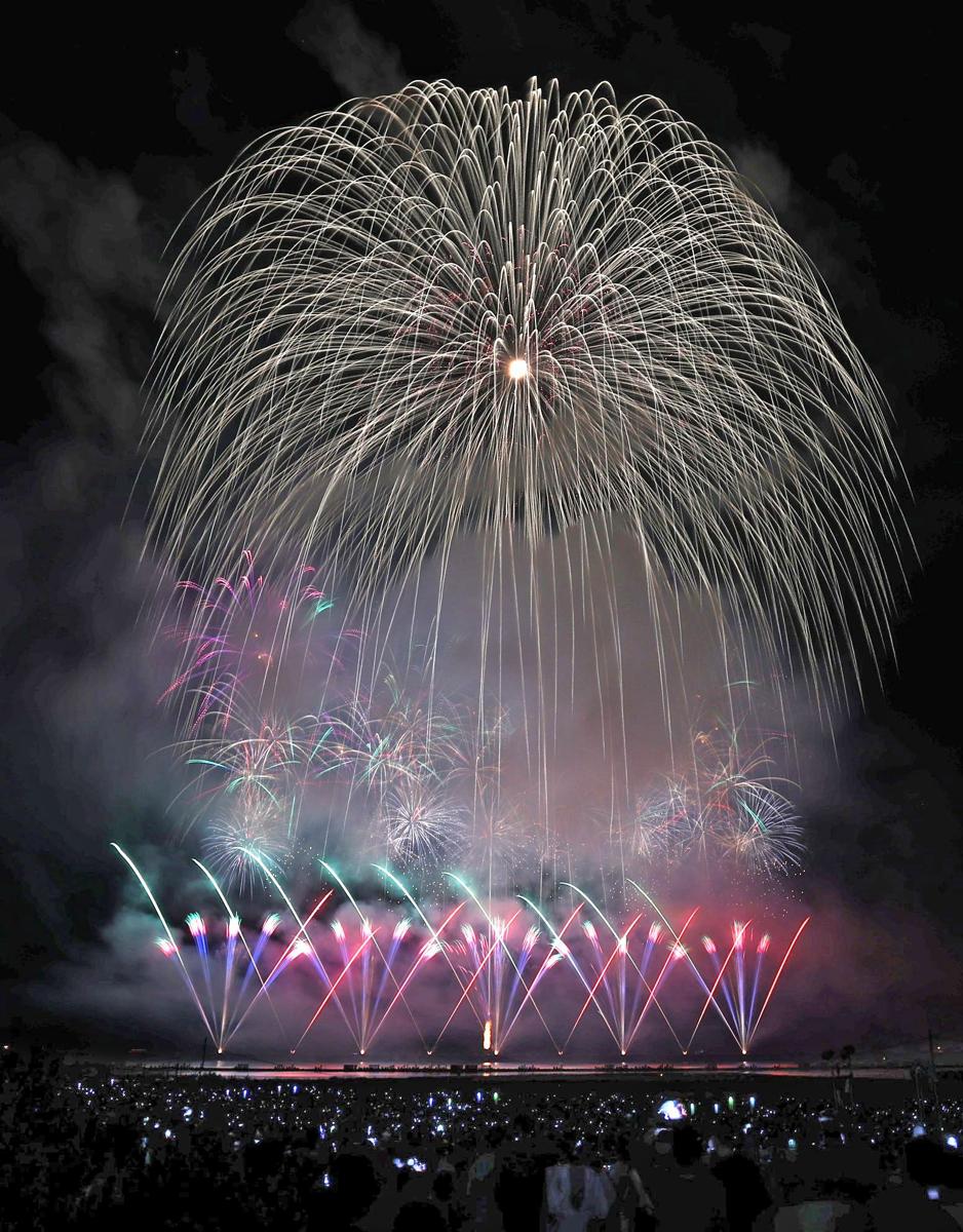 海の大花火大会は7月26日、柏崎市中心部にほど近い中央海岸一帯で開かれる。尺玉100発一斉打ち上げや、海中空スターマインなど、約1万6千発の花火が海上を彩る。