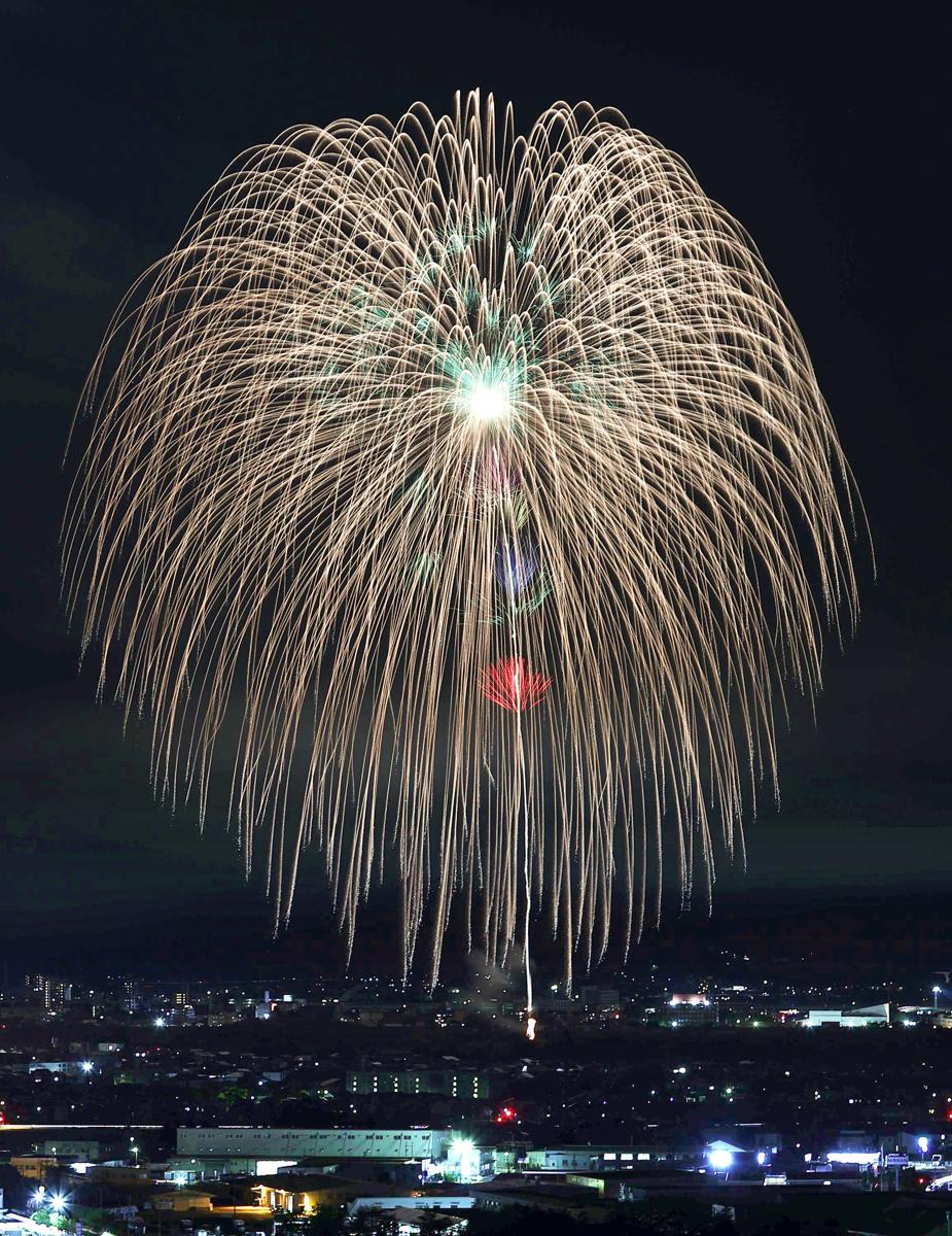 長岡まつり大花火大会(長岡花火)は、新潟県長岡市中心部を流れる信濃川の河川敷で毎年8月2、3日に行われる。秋田県の大曲、茨城県の土浦と並ぶ日本三大花火の一つとされ、復興祈願花火フェニックスや正(しょう)三尺玉などの名物花火が次々と打ち上がる。両岸の河川敷の観覧席に降りかかるかのような、迫力ある花火を楽しめる。