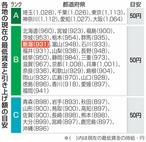 社会 最低賃金全国平均1054円、50円増で上げ幅過去最大・中央審議会決着 賃上げ相次いだ春闘を反映、目安額通りなら全都道府県で時給900円以上に 2024/7/25 9:45 (最終更新: 2024/7/25 10:29) 中央最低賃金審議会(厚生労働相の諮問機関)の小委員会は7月24日、2024年度の最低賃金の全国平均を時給1054円とする目安額を取りまとめた。現在の1004円からの引き上げ幅は50円(約5%増)で決着した。物価高騰... 残り557文字(全文:665文字) ここから先を読むには 続きを読む(会員登録する) 続きを読む(ログイン) 新潟日報朝刊を購読していますか? はい いいえ トップページで最新情報を見る 関連ニュース どうなる新潟県の最低賃金!7月中にも目安発表 生活苦解消願う... 2024/7/22 新潟県内春闘賃上げ平均1万2203円、過去2番目の高水準・連... 2024/6/28 ガソリン誤給油でストーブ発火、胎内市の鳥インフル防疫措置現場... 11/10 不同意わいせつ疑いで北海道の31歳男を逮捕、新潟中央署 11/10 長岡市の70代男性、カードをだまし取られ700万円引き出される 11/10 胎内市の鳥インフルエンザ陽性、採卵鶏の殺処分進む 11/10 [クマ目撃情報]見附市南本町2の公園(11月10日) 11/10 うその申請で上越まつりに露店出店、詐欺容疑で埼玉県の暴力団組... 11/10 「NIC水原」新聞販売店従業員が配達中に不明女子中学生2人保... 11/10 テラリウムでコケを魅力的に 新発田市で「芝農フェスタ」第1弾... 11/10 トキ鉄の車両に乗り込み…運転に挑戦「出発進行!」 上越市で体験会 11/10