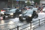 新潟市中央区では通勤時間帯が大雨に見舞われた。深く冠水した道路で車が立ち往生し...