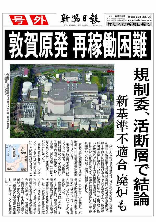 【号外】福井・敦賀原発2号機「新規制基準に適合せず」 原子力規制委員会 2024/7/26 18:40 PDFで号外を見る トップページで最新情報を見る 関連ニュース 新潟県最難関の山はどこ?徹底解説「山のグレーディング」安全登... 2025/9/18 海水温上昇で魚種に異変、漁業者の収入減…難題に直面する水産業... 2025/7/13 森を育み魚も育んで…密接につながる自然界、魚の繁殖を助ける「... 2025/7/13 食卓彩る魚介類、1人当たりの年間消費量はピーク時の半分に…そ... 2025/7/13 記録的不漁続く鮭、サーモンの陸上養殖で代替なるか?費用のハー... 2025/7/13 夏のスタミナ源が「貴重品」に?県内で減りゆくドジョウ、このま... 2025/7/13 年々増える「海のプラごみ」少しでも減らすには?「拾う人を増や... 2025/7/13 「新潟県内唯一の水産教育」守り続け…実習に力入れる海洋高校、... 2025/7/13 藻場の“厄介者”どう売り込む?「人が少ない」を言い訳にせず…... 2025/7/13 1人で船を操る姿に憧れ…隣県山形で初の女性船頭誕生、漁の世界... 2025/7/13 温暖化の一因となる牛のゲップ、「餌に海藻」で減らせるか?瓶内... 2025/6/9 新聞記事から生まれた「富山湾鮨」、自慢の地魚で人を呼び込み…... 2025/6/8